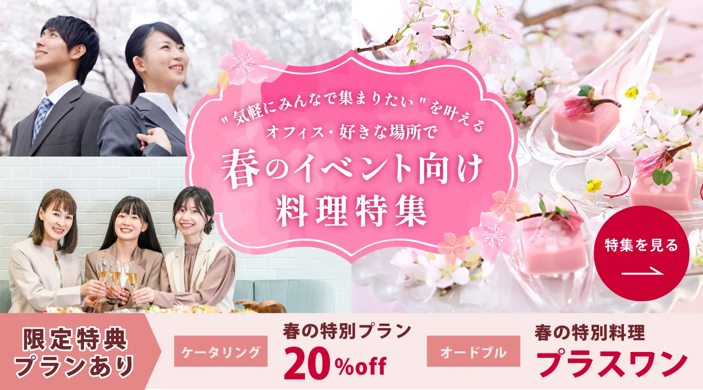 スタッフのサーブの有無が大きな違いとなります。 ケータリングとは、サービススタッフが常駐し、お料理の設置、装飾、配膳、片付け、ゴミ回収、撤収までしてくれるサービスです。ゲストや上層部をお招きする式典や製品発表レセプション、講演会後の会食、スポーツイベント等、お客様が進行にご専念されたい場合はケータリングが最適です。 一方、オードブルとは、調理済みのお料理を使い捨て容器でお届けするサービスです。オードブルはワンウェイの宅配感覚で価格もお手頃です。チームでのランチ会、納会、社内懇親会などアットホームな雰囲気の会におすすめです。